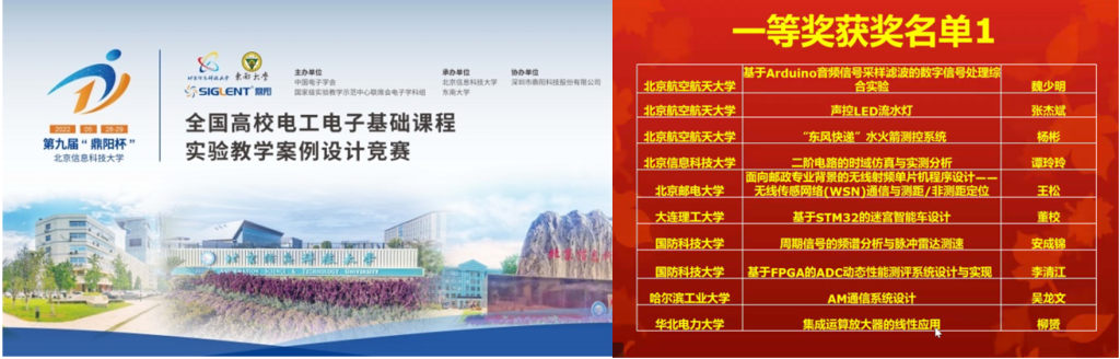 全国高校电工电子基础课程实验教学案例设计竞赛(鼎阳杯)由中国电子学会和国家级实验教学示范中心联席会电子学科组联合举办,旨在进一步推动电工电子基础课程实验教学内容研究探索、工程实践、自主创新的改革,促进实验教学水平与教学质量提升,推广各高校实验教学优秀教学资源共享,激发广大教师开展实验教学建设与改革热情。本届竞赛共有全国609件作品参加初赛,最终评出全国一等奖34项、二等奖42项、三等奖49项。
