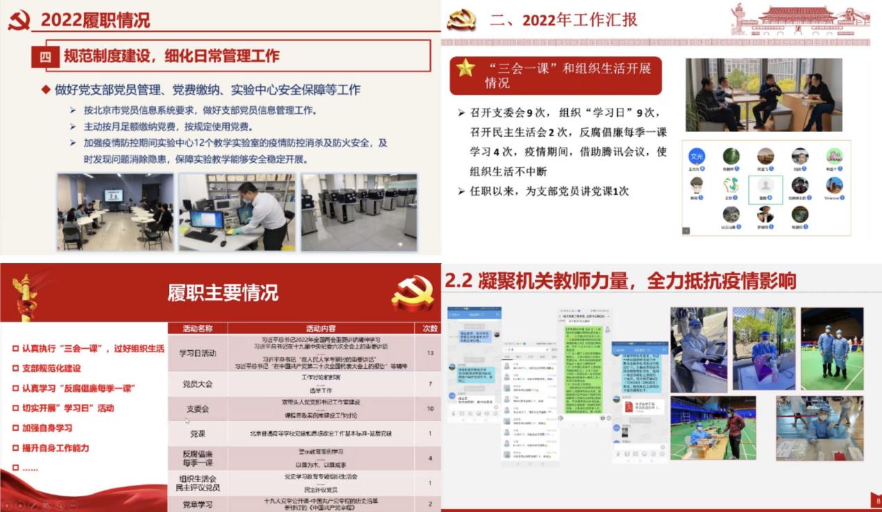 2022年度党建述职评议以现场述职和书面述职相结合的方式进行,203党支部、204党支部、实验中心党支部、机关党支部等4位教师党支部书记在线上进行了现场述职。公司党委书记徐亚军同志对现场述职的党支部书记工作情况进行了逐一点评,指出了各支部工作中应该注意的问题,提出了相应的改进措施。