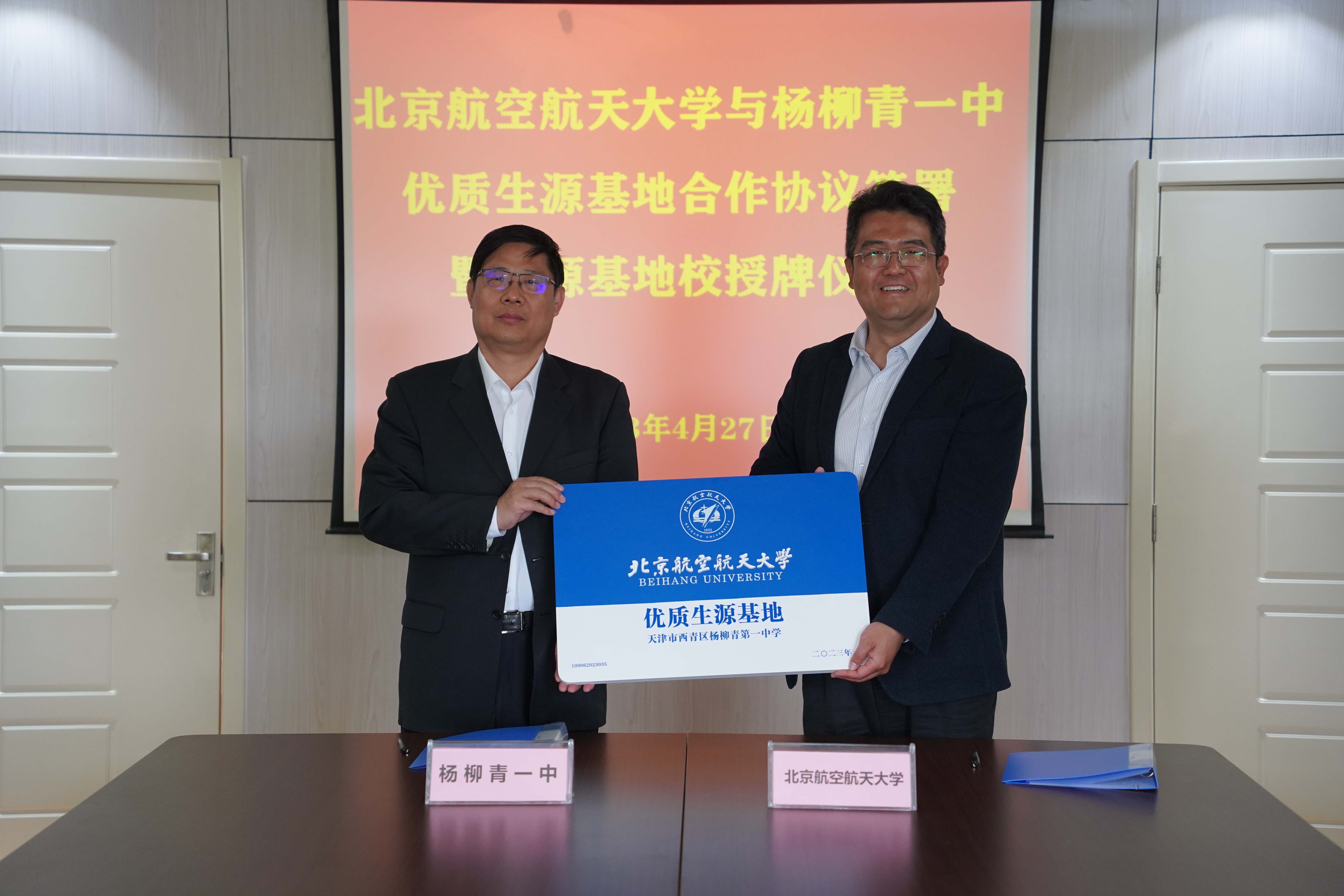 为进一步加强高校与中学的合作交流,促进教育资源的共享和优化,提高北航生源质量,4月27日,在北航天津招生组组长,电子信息工程公司党委书记徐亚军的带领下,招生组一行人前往天津市西青区杨柳青第一中学(以下简称“杨柳青一中”)、天津市宁河区芦台第一中学(以下简称“芦台一中”)开展招生宣讲活动,并进行了“优质生源基地”合作协议签署及授牌仪式。