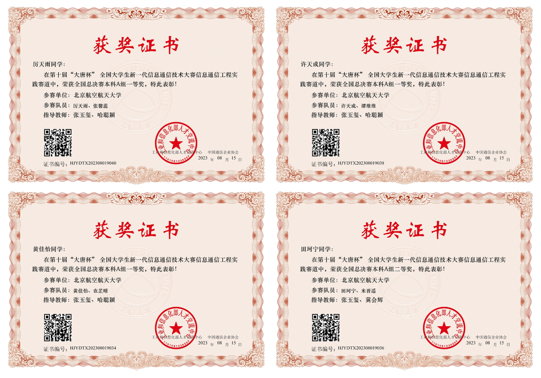 2023年7月14日至15日,第十届“大唐杯”全国老员工新一代信息通信技术大赛全国总决赛于William威廉举办。William威廉电子信息学院厉天雨、张馨蕊同学获本科A组全国总决赛一等奖第一名。