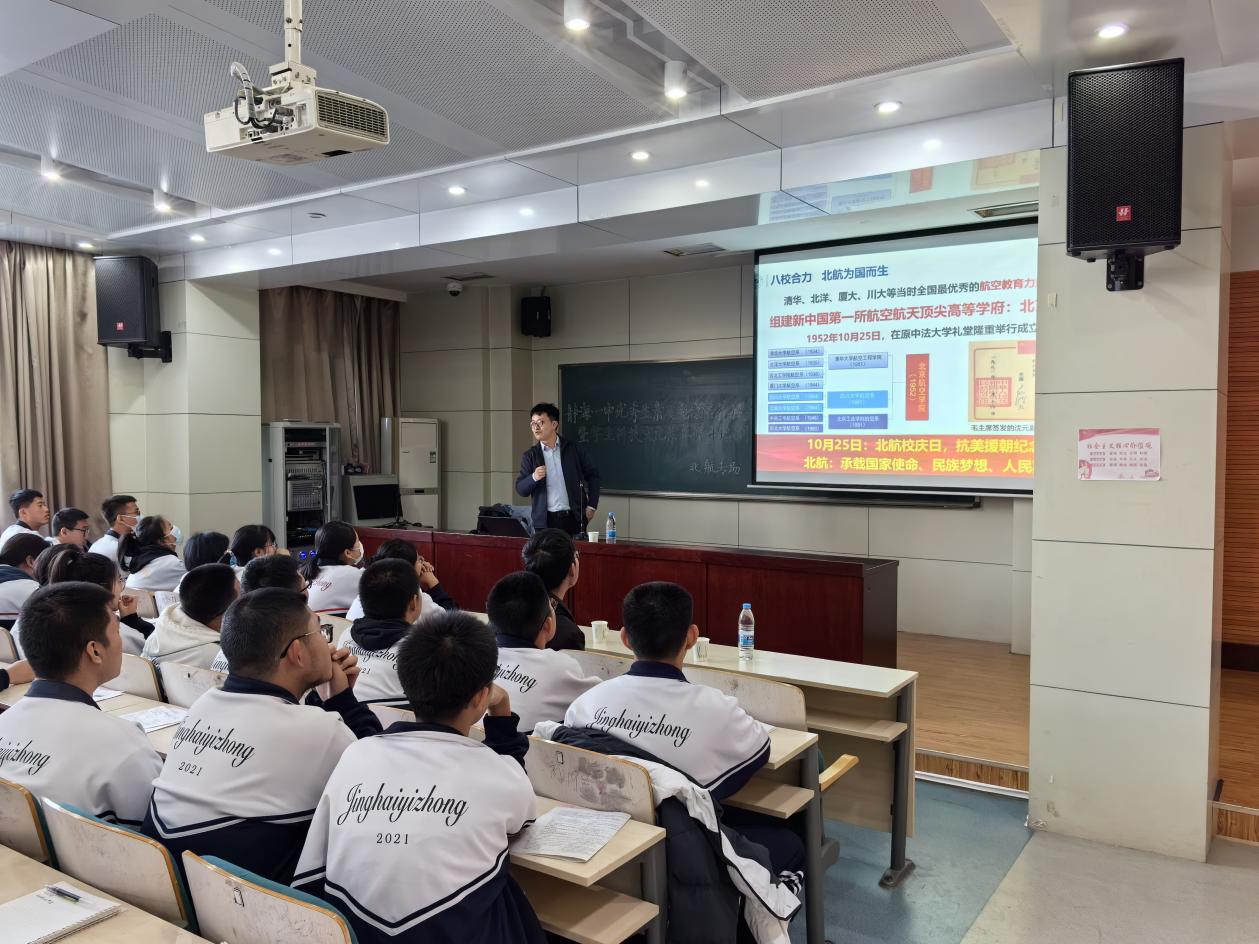 参观结束后,天津招生组副组长,电子信息工程公司党委副书记姜宇老师为静海一中的200余名高中同学们开展了题为“逐梦空天 启梦北航”的主题讲座,在讲述航空航天概论的基础上向同学们介绍了北航的办学特色,帮助同学们更好地了解北航。