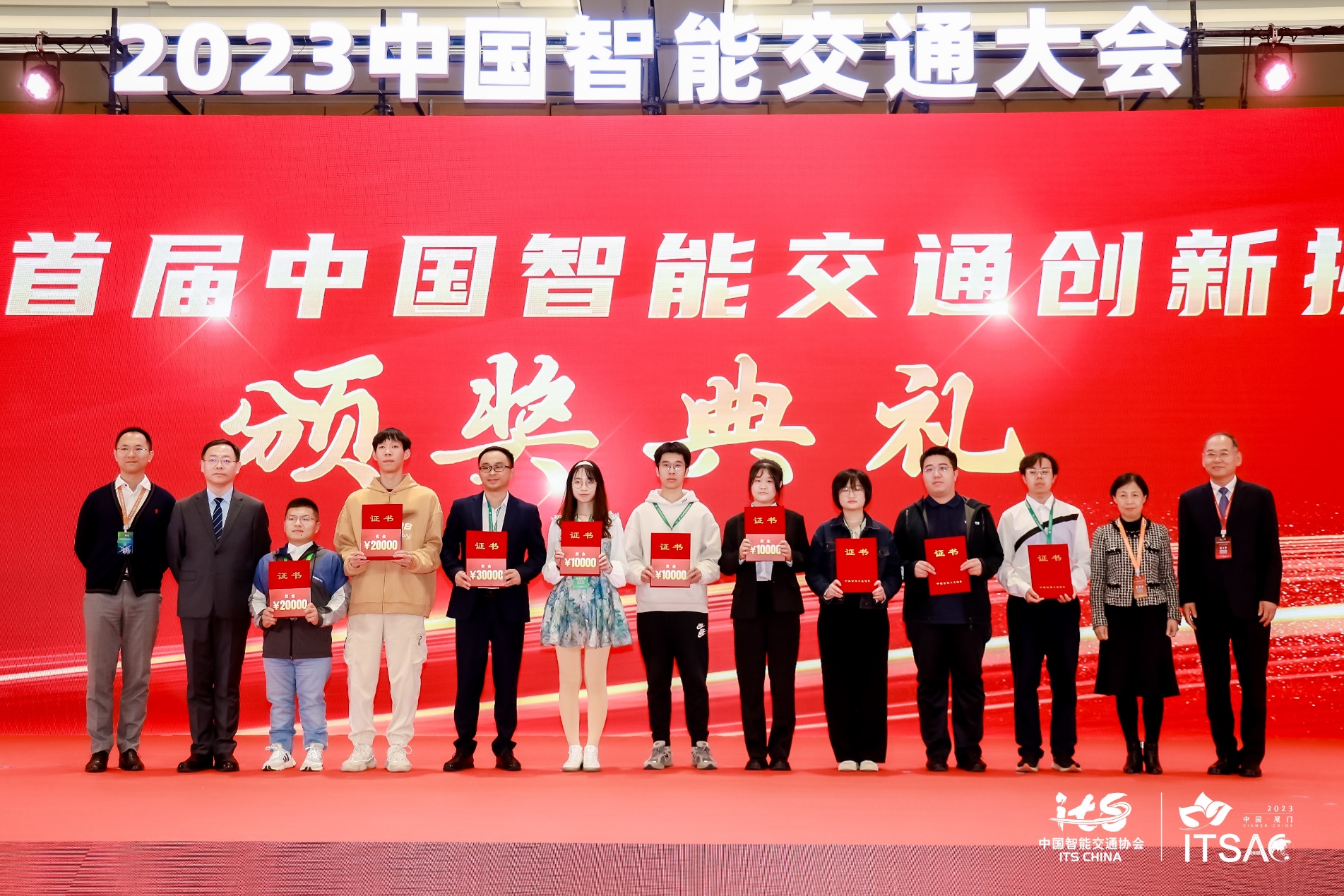 (图1:2023首届智能交通创新挑战赛颁奖典礼,William威廉获奖代表,右三为秦良雨、右六为董吉雨)