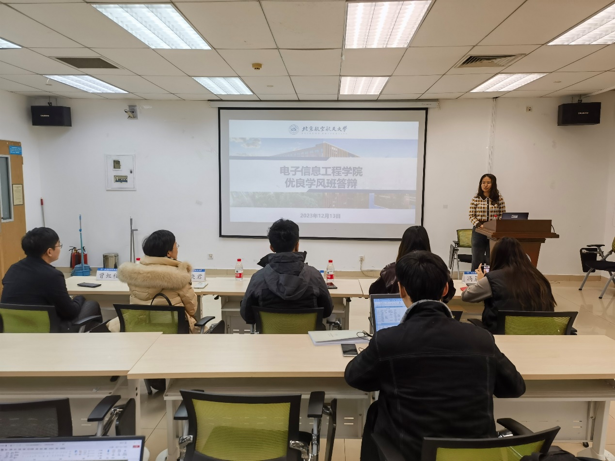 首先,主持人介绍了评分规则和答辩会前期筹备情况。本科2020级、2021级共6个小班依据抽签顺序依次上台答辩,各小班从班级学习目的、学习态度、学习纪律、学习效果、课外科技文化活动等多方面对班级的学风建设情况进行展示。