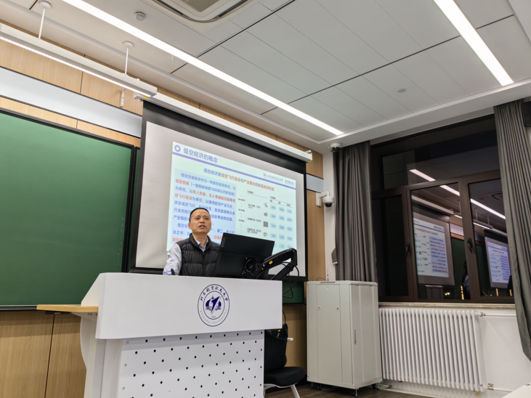接着,刘老师为同学们介绍了低空经济与新质生产力的关系。低空经济是当前我国新质生产力的主要组成部分。其发展由无人机技术、电源电池技术、新材料技术等共同推进,重新定义了未来出行的形态。