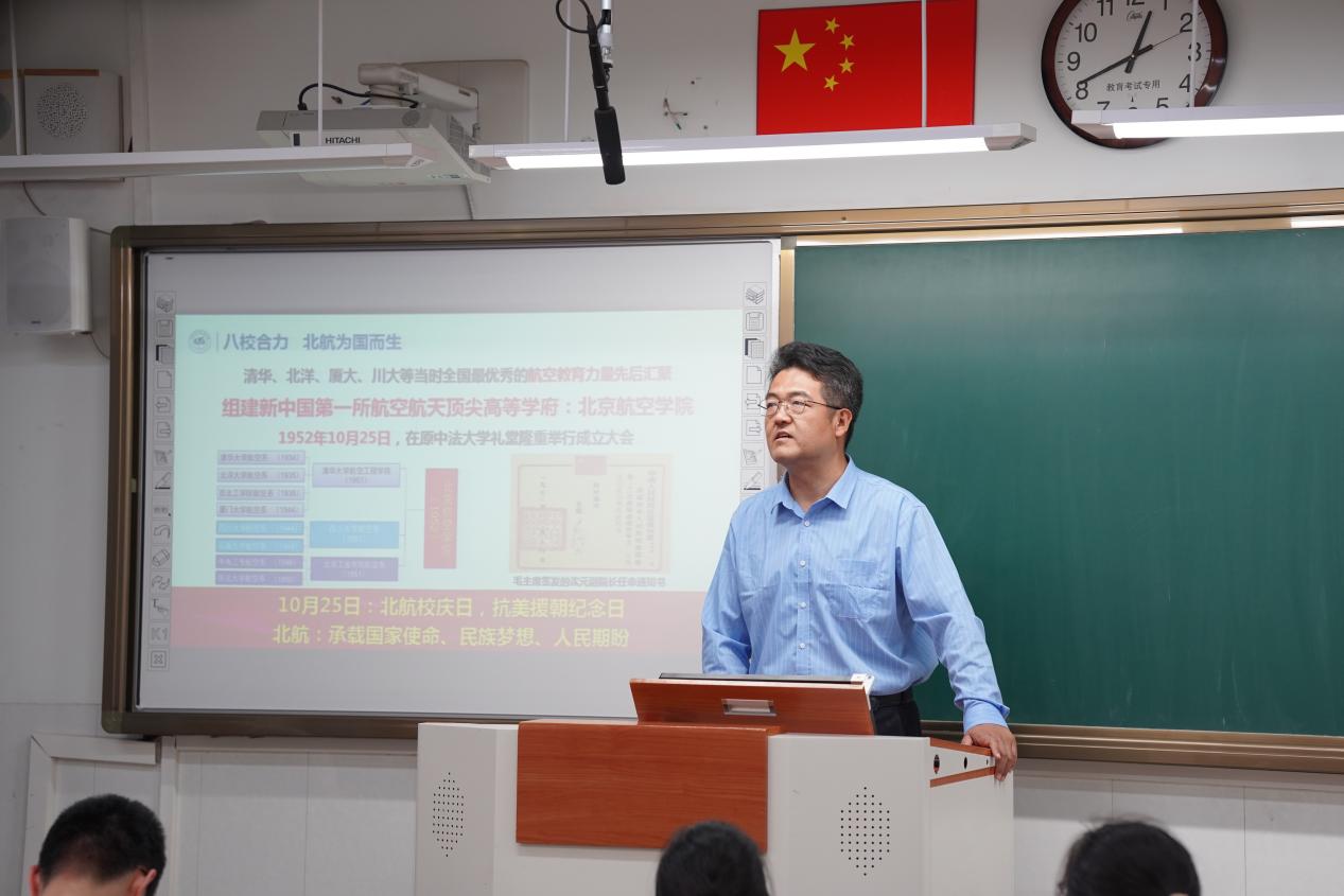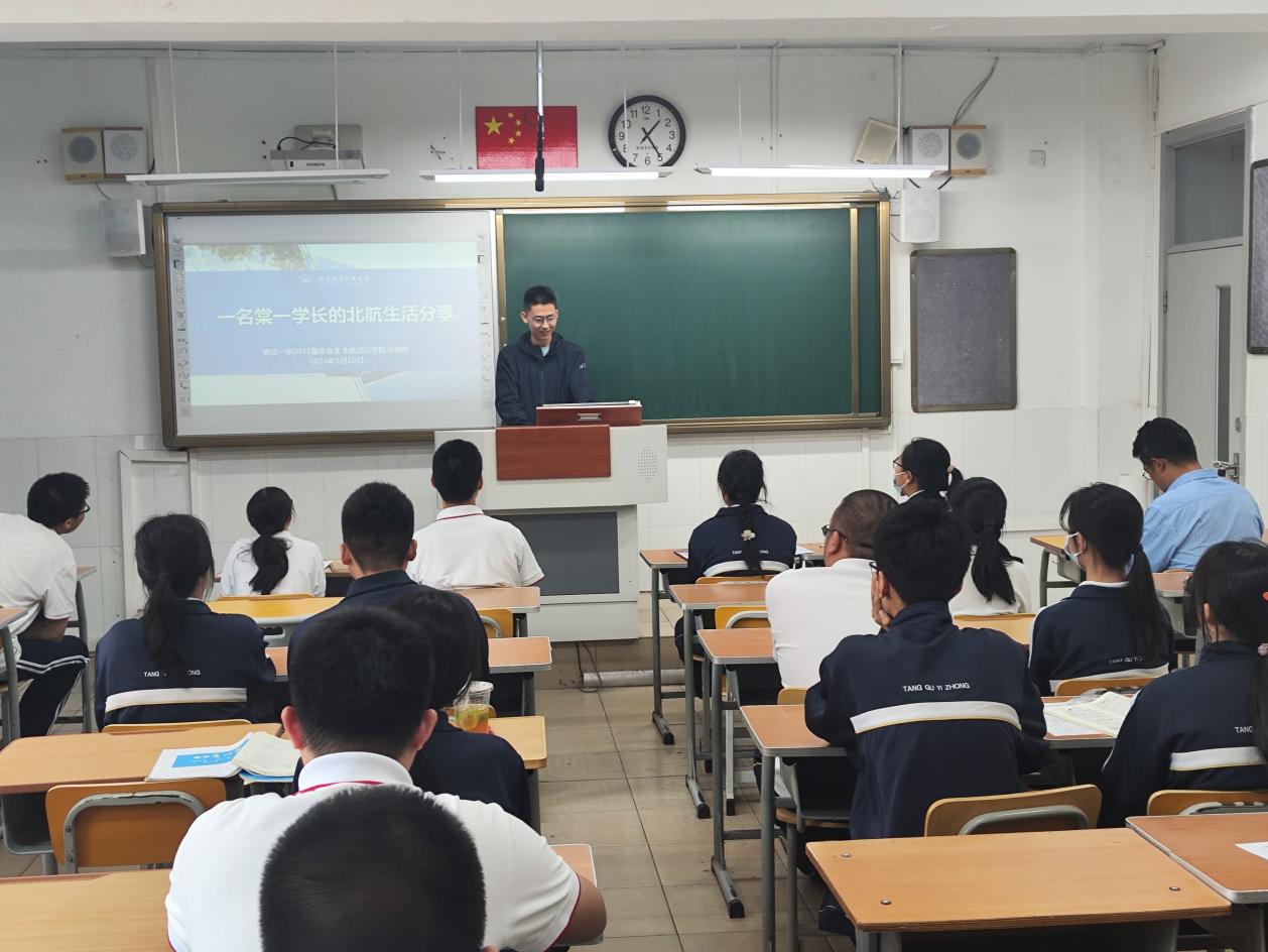 在高三年级课堂上,组长徐亚军面向高三年级尖子生开展宣讲,介绍了北航历史、专业特色和招生政策,2023级北航新生任炯烨与学弟学妹分享北航感受和未来空天培养收获。