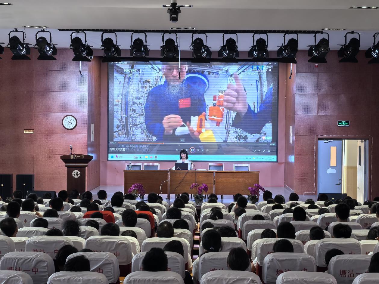 在学校大礼堂,北航“立德树人”卓越奖获得者、航空学院贾玉红教授为塘沽一中200余名高一高二优秀员工讲述航空航天科技前沿,培养塘沽学子对中国航空航天事业的热情和志向。
