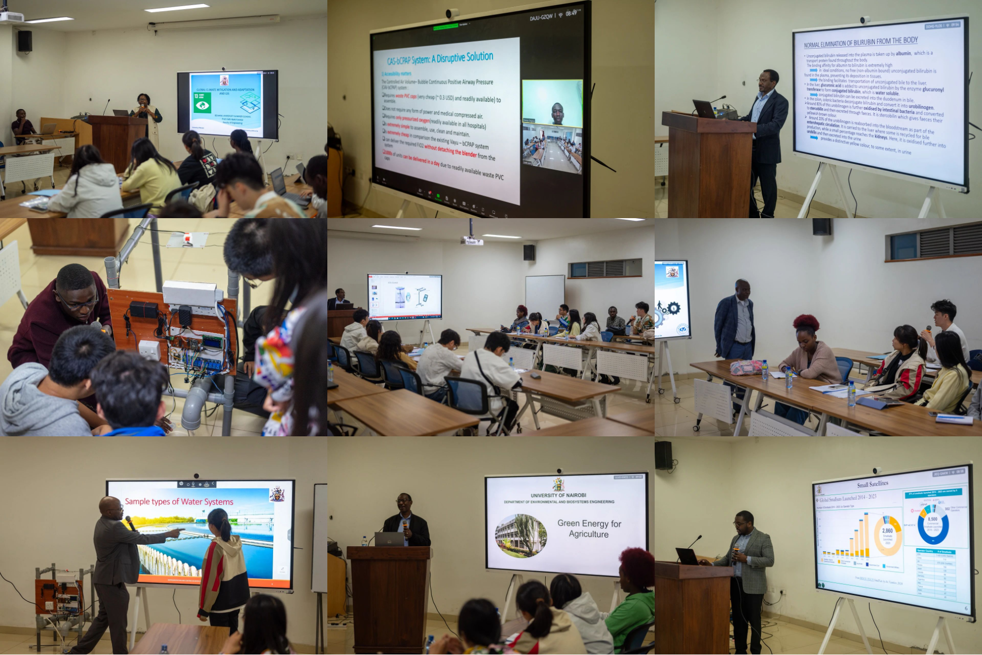 在暑期学校理论课程学习部分,同学们参加了内罗毕大学工程学院Prof.Faith Njoki Karanja讲授的“全球气候减缓与适应及地理信息系统(Global Climate Mitigation and Adaptation & GIS)”、Dr. Davies Rene Segera讲授的“改进新生儿护理:肯尼亚的经济型光疗与CPAP解决方案(Improving Neonatal Care: Affordable Phototherapy and CPAP Solutions in Kenya)、Prof.G.N.Kamucha讲授的“新生儿黄疸的光疗治疗(Phototherapy for Treatment of Neonatal Jaundice)”、Prof.Paul Ochola 讲授的“供水系统的原理与控制(Instrumentation and Control in water System)”、Prof.Duncan Mbuge讲授的“农业中的绿色能源(Green Energy in Agriculture)、Dr. Cosmas Kiruki讲授的微纳卫星的制造与发射(Implementation and Launch of Nanosatellites)、以及Prof. Ayub Gitau讲授的“非洲工程职业及其认证机制(Engineering Profession and Accreditation Mechanized Systems in Africa)”共7门课程。