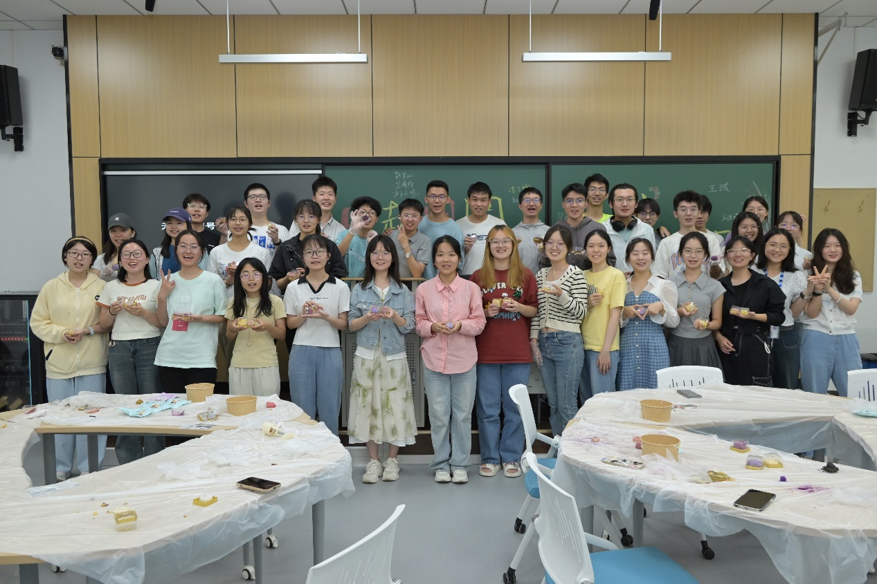 主持人首先向大家介绍了中秋节的起源与传统,讲述了古人如何通过赏月寄托思念之情。接下来,主持人详细讲解了月饼的制作方式,带领大家一起开始手作月饼。同学们四人一组自由组队,倒水,和面,找准比例,用面粉把月饼皮染成自己喜欢的颜色,把面团揉捏筋道,包上喜欢的馅料,再放入模具按压成型,一个冰皮月饼就新鲜出炉了。同学们做出来的月饼个个圆润饱满、色泽诱人,大家沉浸其中,欢声笑语从未停歇。