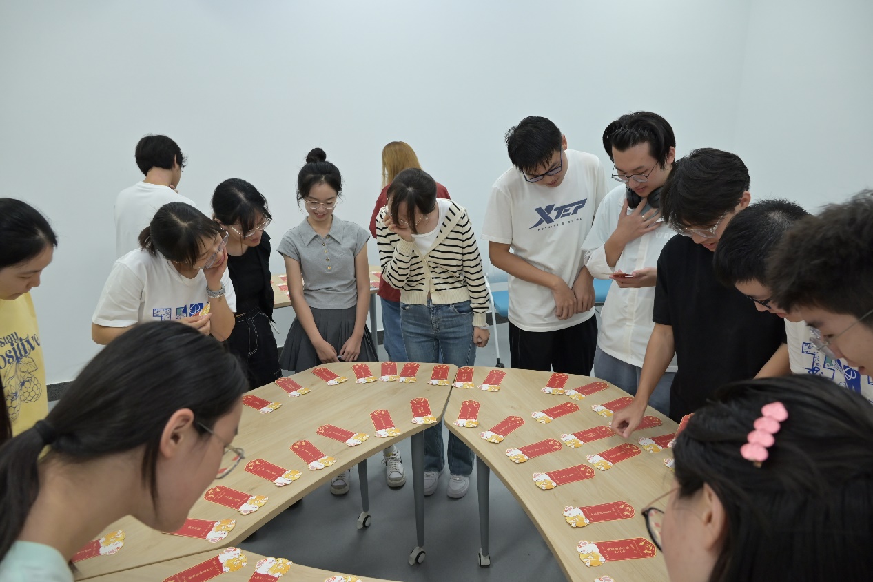 品尝完月饼,就到了猜谜环节了。同学们看着谜面冥思苦想,时不时一起讨论,气氛颇为热烈。