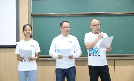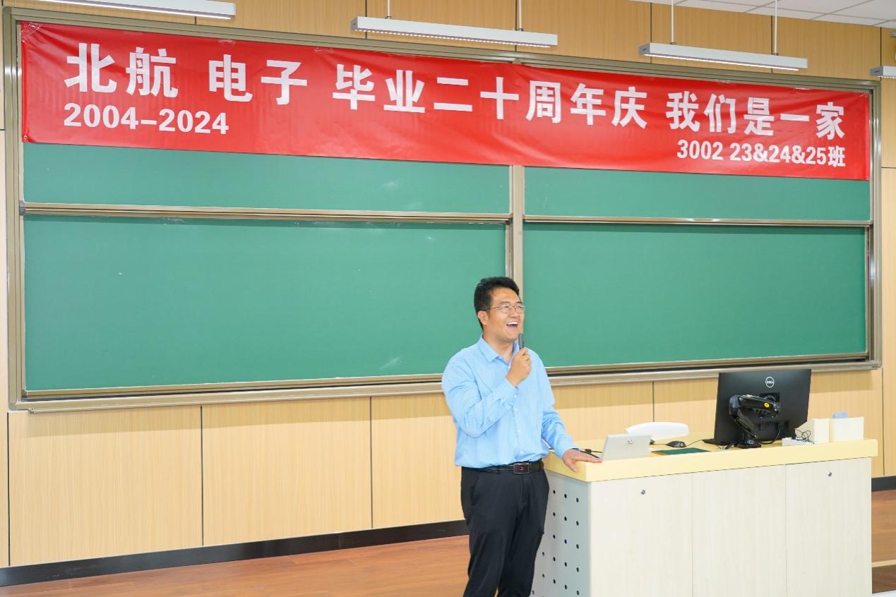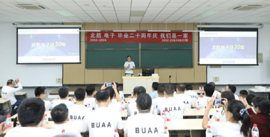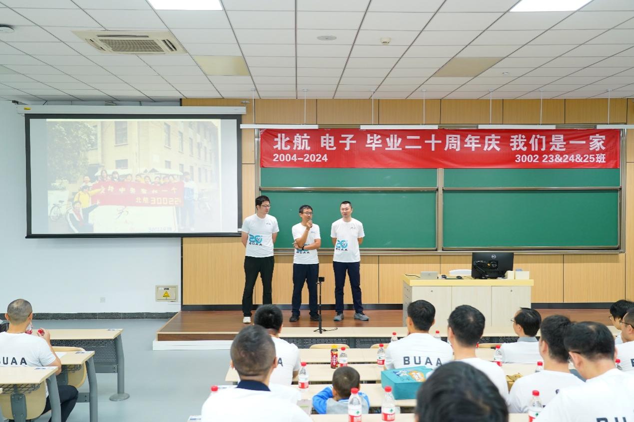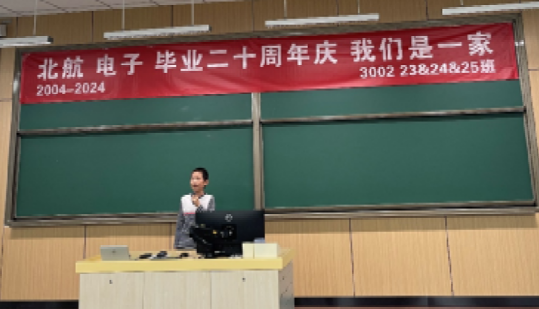 活动首先在学院路校区主M102教室举行,电子信息工程公司党委书记徐亚军出席活动,教职工代表同时也是2000级员工的电子信息工程公司副经理蔡开泉、教师发展中心副主任马坤、电子信息工程公司教师刘婷婷共同出席,2000级300223、300224、300225班员工们一起召开了一场名为“匆匆二十年”的班会。班会由2位毕业员工和1位“航二代”联合主持。