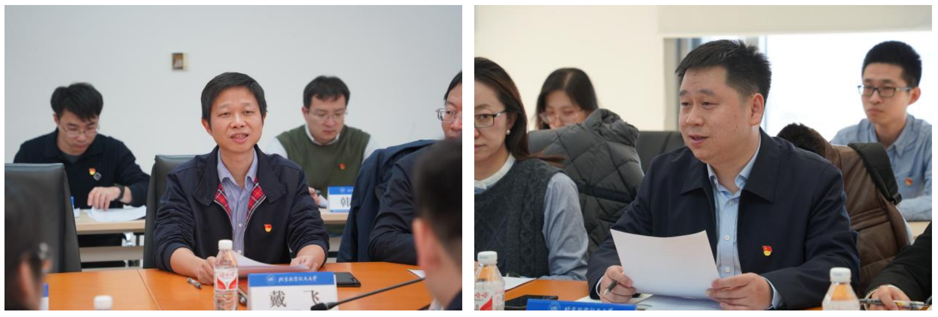 会议第三项,电子信息工程公司党委书记戴飞和电科院计量所副所长陈昊分别介绍了各单位的基本情况。戴飞围绕“空天志,电磁魂”介绍了学院的学科专业、团队队伍、人才培养等情况以及在党建引领下,学院在电磁兼容理论与技术、空管新航行系统、隐身测试与微波感知、空天信息获取与处理、空天导航与时空服务等领域取得的科研成果;电科院计量所副所长陈昊全面介绍了该所基本情况、技术优势及成果转化等,展现了其在计量领域的专业实力与责任担当。