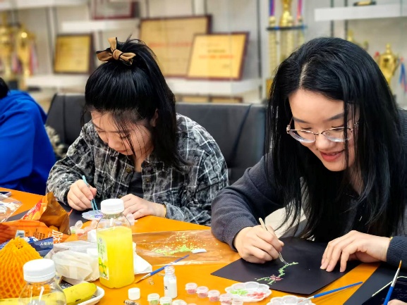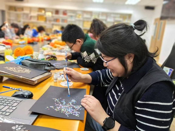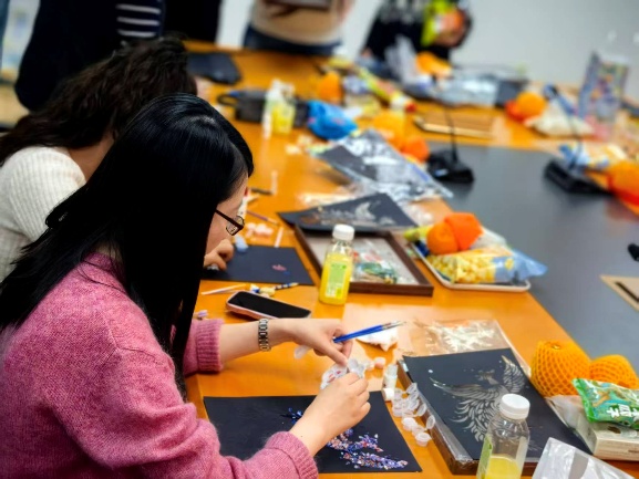 本次活动以非遗文化体验为主题,特别设置螺钿相框、宋锦配饰、螺钿胸针等特色手作项目。为提升活动体验与作品呈现效果,学院特邀新媒体艺术与设计学院孙振西老师团队现场指导,孙老师从传统文件介绍、工艺技巧、创意设计等方面进行细致讲解与示范,让参与者更好地掌握非遗手作要点。在专业老师的耐心指导下,一件件独具匠心的作品陆续完成。大家在动手创作中感受传统工艺的独特魅力,现场暖意融融、欢声笑语不断,既增进了亲子情感交流,也让非遗文化在指尖传承。