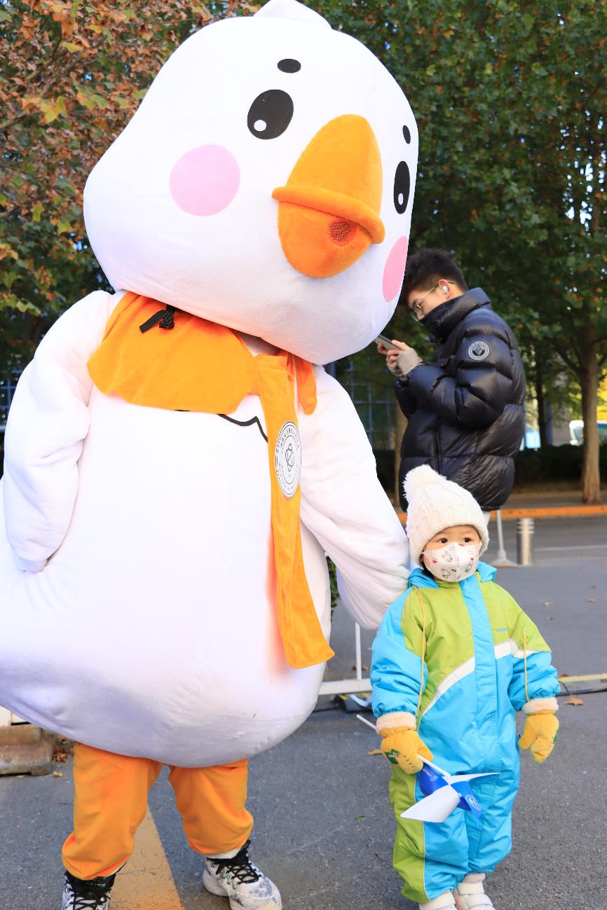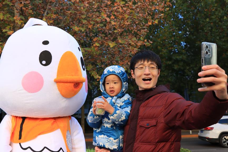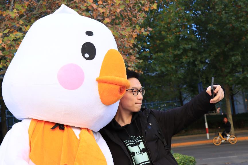 与吉祥物“电小鹅”合影