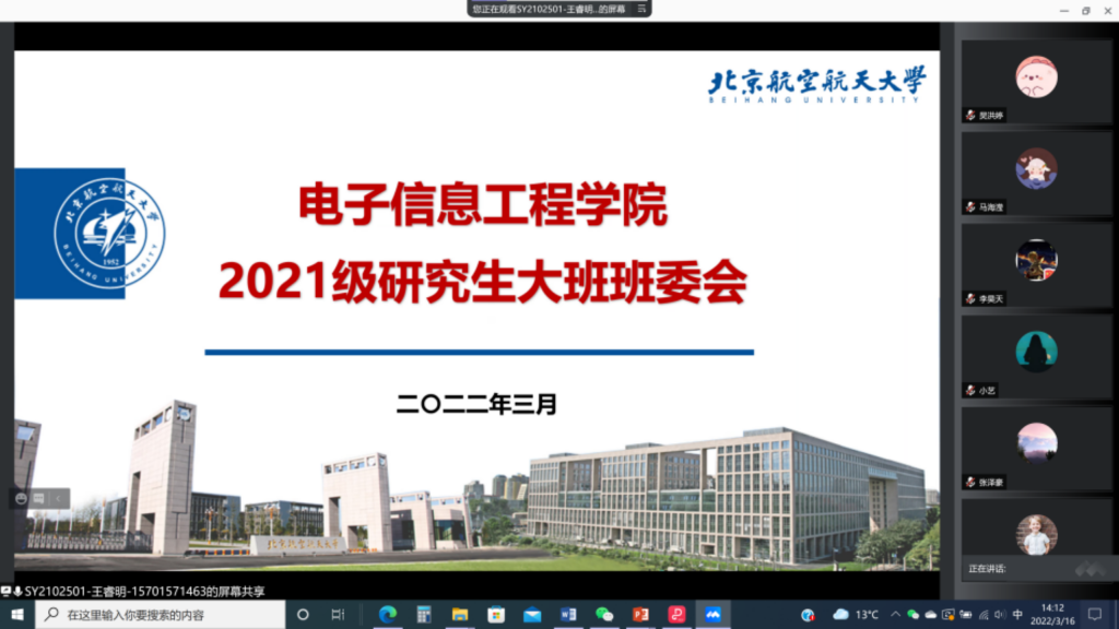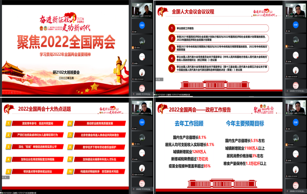 今年的全国两会是在我国进入全面建设社会主义现代化国家、向第二个百年奋斗目标进军新征程的重要时刻召开的一次重要会议。聚焦2022年全国两会,为传达学习2022年全国两会重要精神,大班班长杨鹏瑜带领大家重点学习两会议程、热点问题、重点关注三个方面,并就《政府工作报告》进行深一步的讲解。会议强调,作为北航学子,要将两会精神落实到今后的工作学习中,不负青春、担当有为,为成为空天信息领域一流人才而努力奋斗。