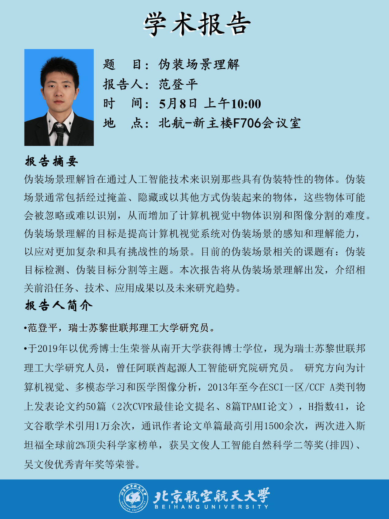 范登平,于2019年以优秀博士生荣誉从南开大学获得博士学位,现为瑞士苏黎世联邦理工大学研究人员,合作导师为Luc Van Gool教授,曾任阿联酋起源人工智能研究院研究员。 研究方向为计算机视觉、多模态学习和医学图像分析,2013年至今在SCI一区/CCF A类刊物上发表论文约50篇(2次CVPR最佳论文提名、8篇TPAMI论文),H指数41,论文谷歌学术引用1万余次,通讯作者论文单篇最高引用1500余次,Github开源项目合计Stars约1.9K次,两次进入斯坦福全球前2%顶尖科学家榜单,获吴文俊人工智能自然科学二等奖(排四)、吴文俊优秀青年奖。 设计的基于组-背景挖掘的搜索识别模型SINet-V2,因大幅提升“伪装目标检测”任务精度而被中国人工智能学会(CAAI)评定取得了国际领先水平,被英国权威杂志《New Scientist》报道。 应用方面,公开16项中/美发明专利, 技术被用于华为、阿里、日本LPIXEL公司。设计的并行反向注意力网络PraNet可从结肠镜图像中精准地分割息肉,为医生辅助诊断提供了非常有价值的信息,在MediaEval2020竞赛上取得精度指标冠军并被斯坦福2022年人工智能指数报告引用, 被集成到华为算法库中。 主编1本中文学术专著,是IEEE高级会员、CVPR2023领域主席、IJCAI21和23的资深程序委员会委员、CCF-CV执行委员、获中国卓越期刊行动计划国际刊物MIR2022年度优秀编委、2021年CCF优博等荣誉。